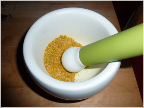 One real simple way to get creative in cooking is creating your own spice rubs for meats.  I don’t have an exact recipe, but I have a favorite type that I use on chicken, pork and seafood.  Most of the year I use a lot of lemons and limes in cooking since the citric acid prevents some foods from turning from oxidation and usually brightens the flavor of whatever you are making.   To me it is a total waste to discard all of those fantastic citrus peels, especially since they make a fantastic base for a citrus rub.   Zest your favorite citrus fruits (u usually end up with lemons, limes and oranges), spread evenly on a paper towel and allow to dry for 1-2 days.  Once dried, grind them up in your mortar and pestle until you have a somewhat fine citrus powder.