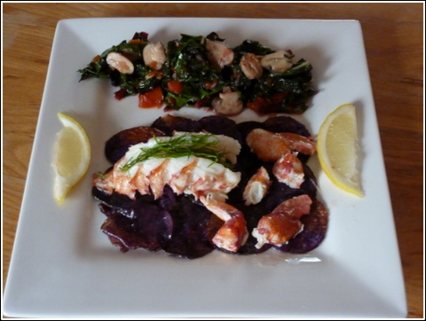 For the Lobster, I made Potato Rafts to set the poached lobster on, and for the Turkey I used them to make mashed root vegetables (turnips and potatoes, topped with honey sauteed carrots).  The texture was similar to baby red or Yukon gold potatoes, and the flavor was a little bit sweeter. There was none of the mineral taste I expected from such a dark blue/purple color.  The color for the potato rafts was very deep purple, and the mashed potatoes came out more lavender in color from boiling the potatoes first (a lot of the color transferred to the water used to boil them).  I could not have been more pleased with the results and will be making them a staple ingredient that adds both needed color to the plate and complementary flavor as a side to many many dishes.  Use them anywhere you would use white potatoes.  French fries, hash browns, Boil ’em, Mash ’em, Stick ’em in a Stew.
